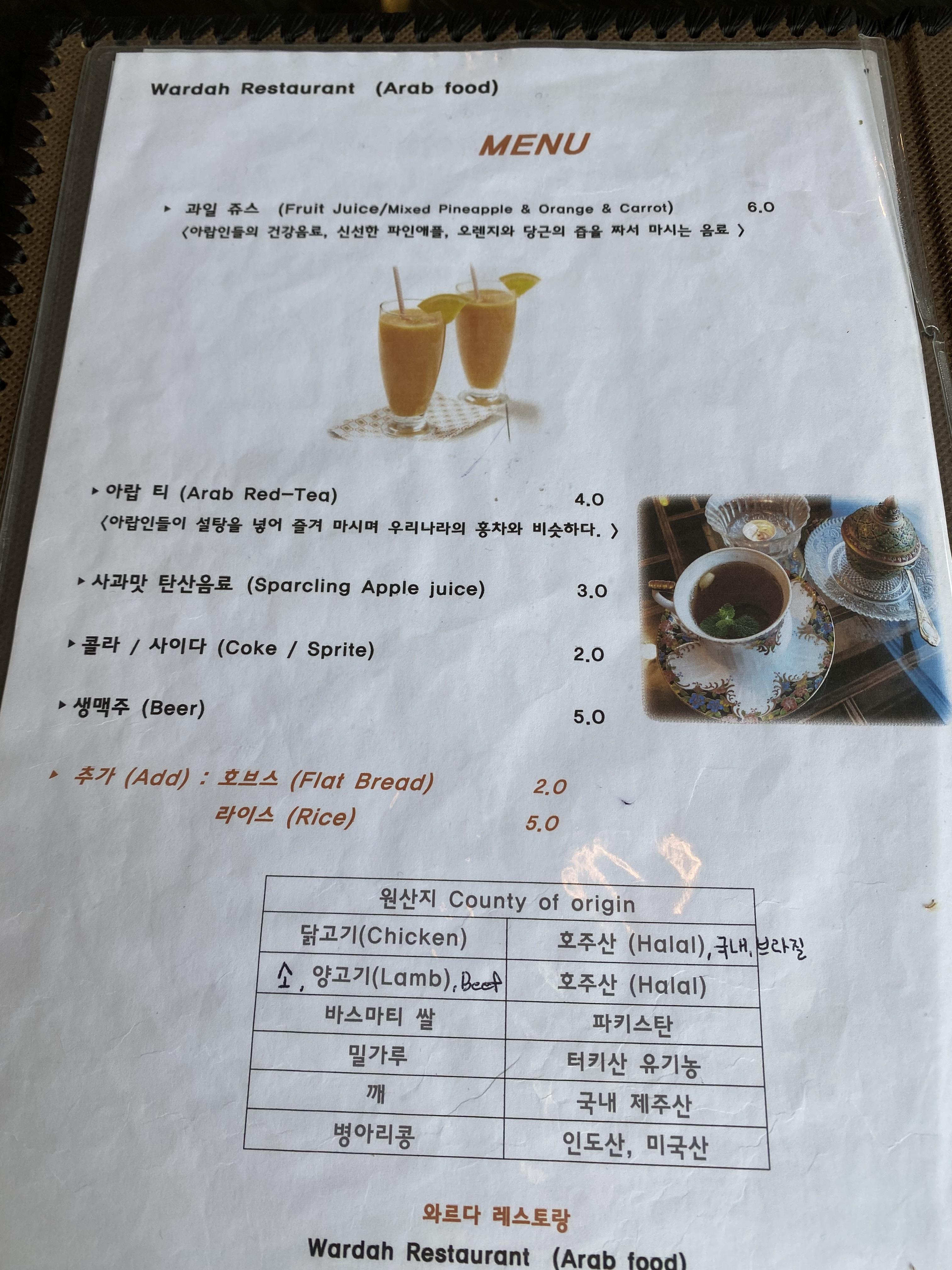 음료는 과일주스랑 아랍티 기본 탄산음료와 맥주가 있었습니다. 우리는 아랍티를 주문하였습니다.
