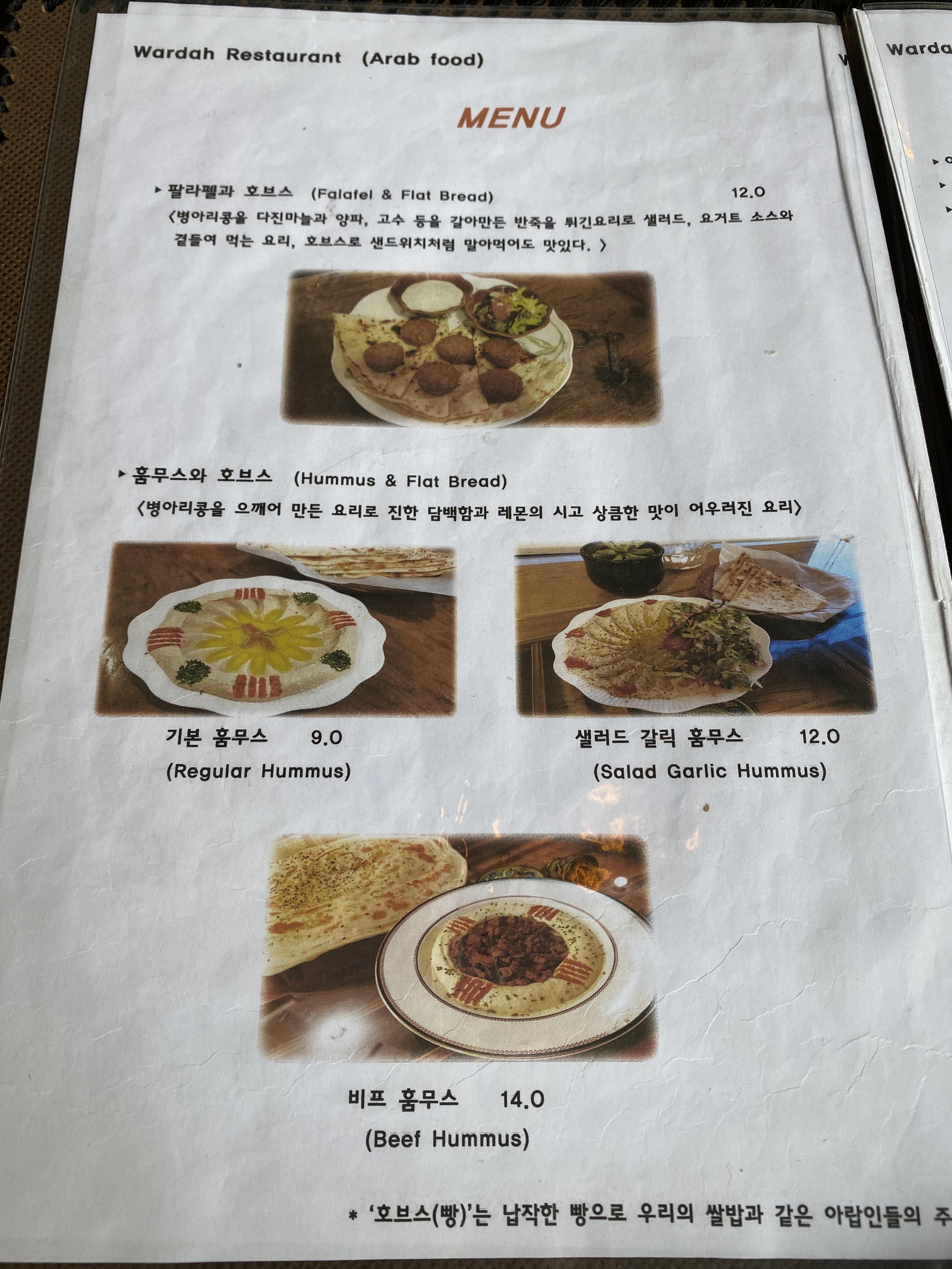 비스 홈무스도 있고, 아랍음식이라 닭고기, 양고기, 소고기를 활용한 음식들이 메뉴에 있습니다.