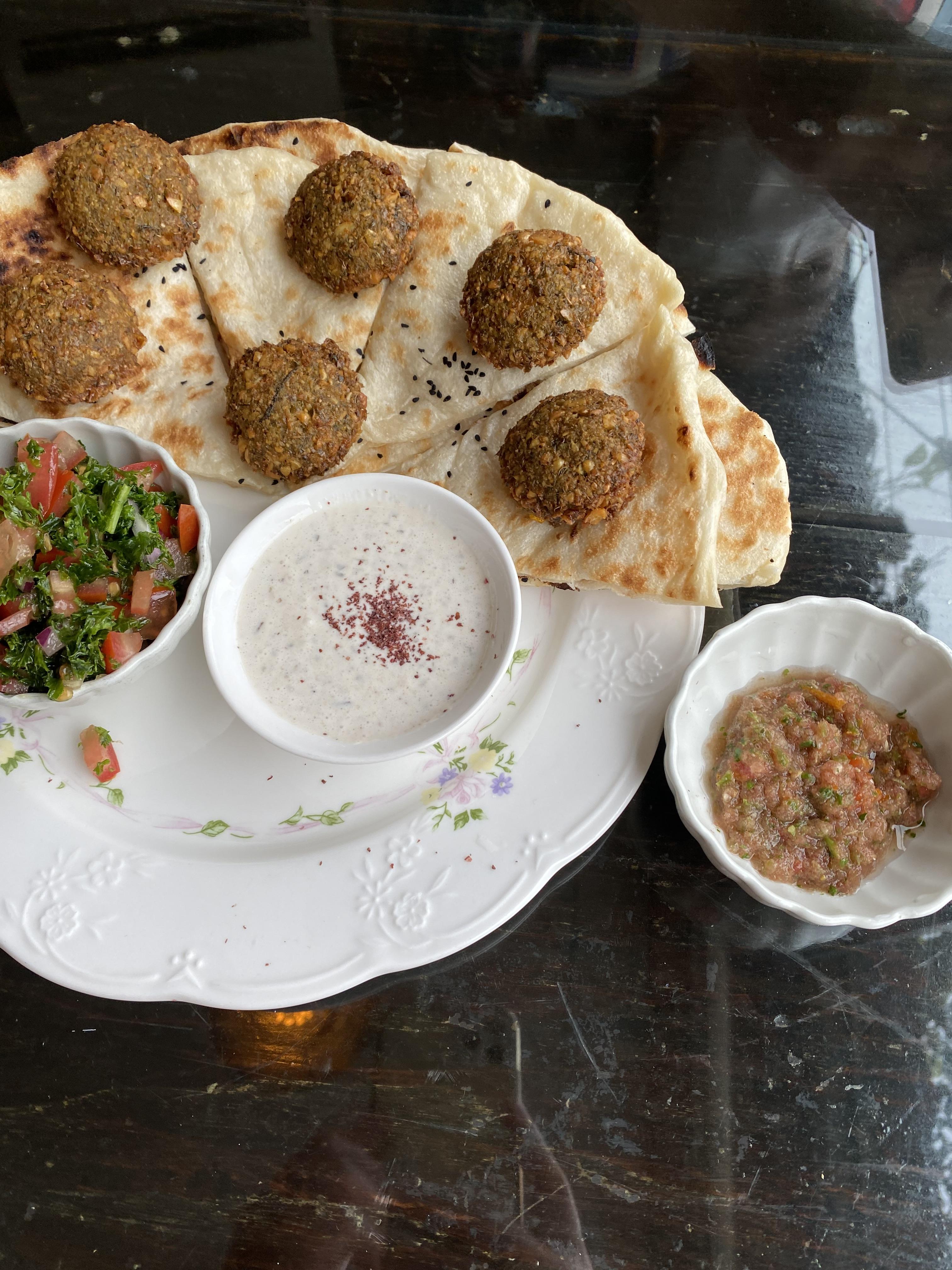 팔라펠과 호브스가 나왔습니다. 호브스(난 같은)는 쫀득하니 맛있었습니다. 위에 올라간건 병아리콩 베이스에 마늘 양파 등을 갈아 넣어 만든걸 튀긴건데 생긴건 꼭 미트볼처럼 생겼습니다. 고기는 안들어갔습니다.
