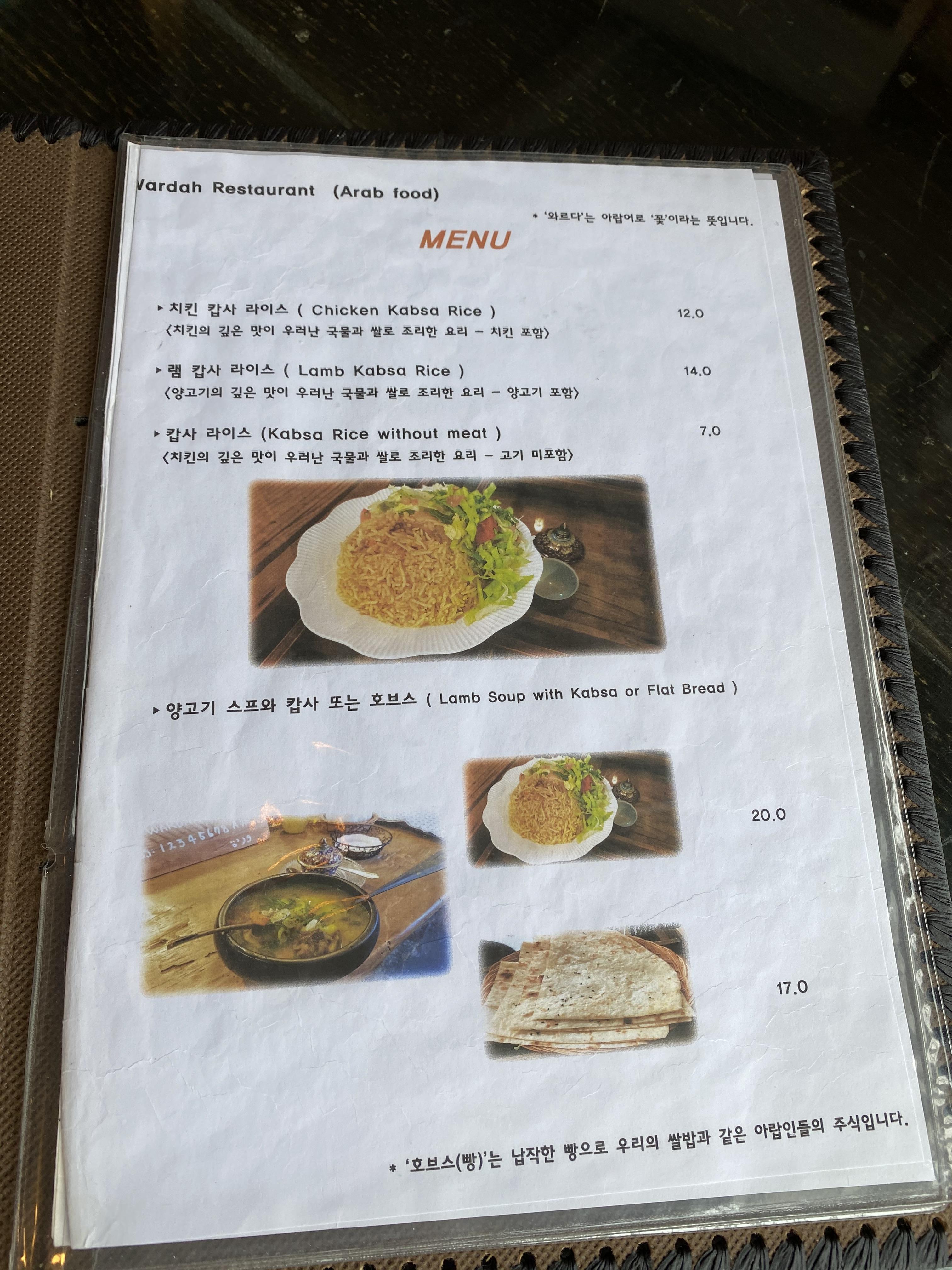 램 캅사 라이스, 양고기 스프와 캅사 또는 호브스 메뉴가 있는데 호브스는 우리에게 익숙한 인도의 난과 비슷한 빵 같았습니다.