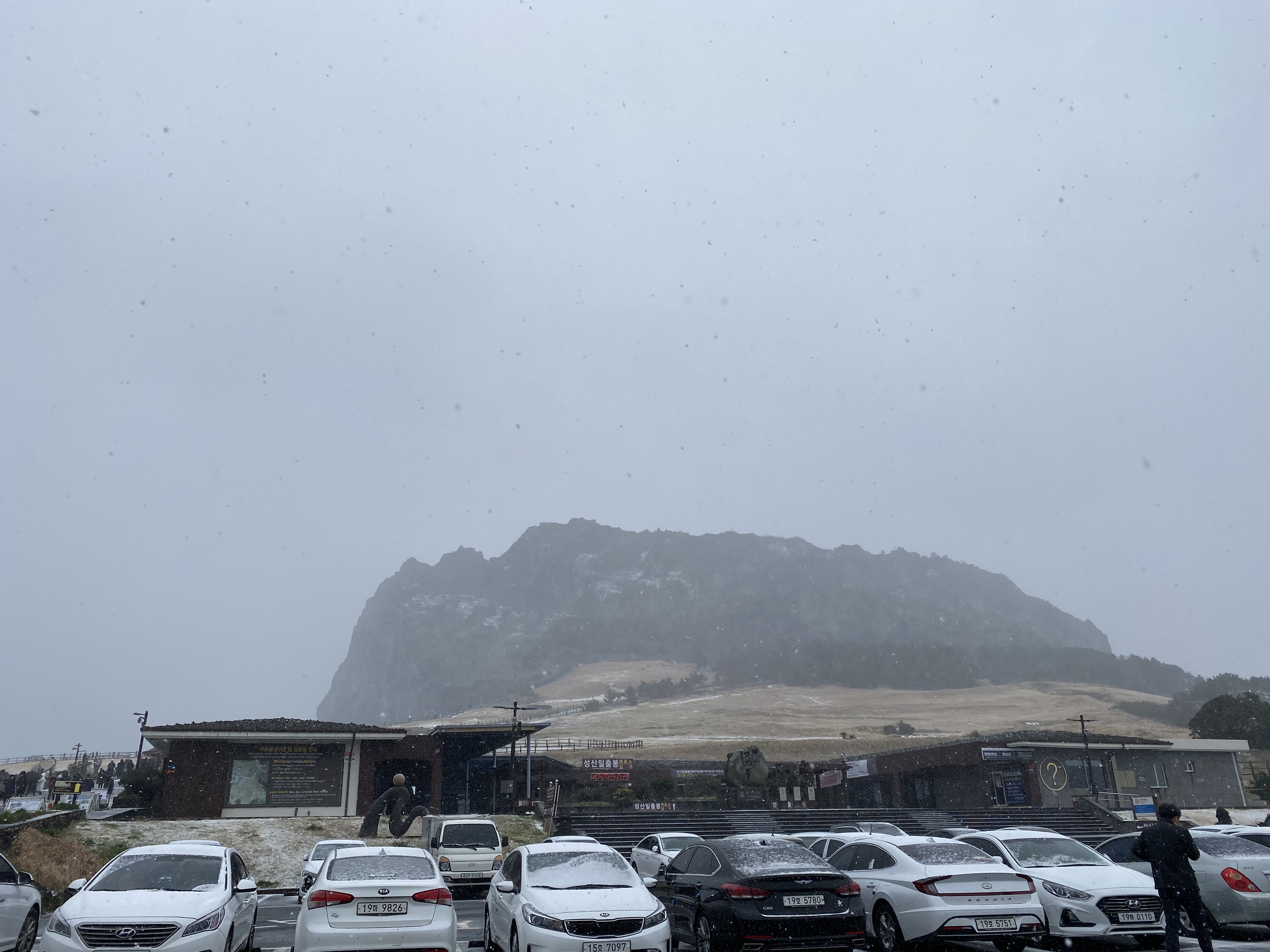 2월의 눈내리는 성산일출봉입니다. 군데 군데 흰 눈이 쌓여있는 모습이 보입니다.