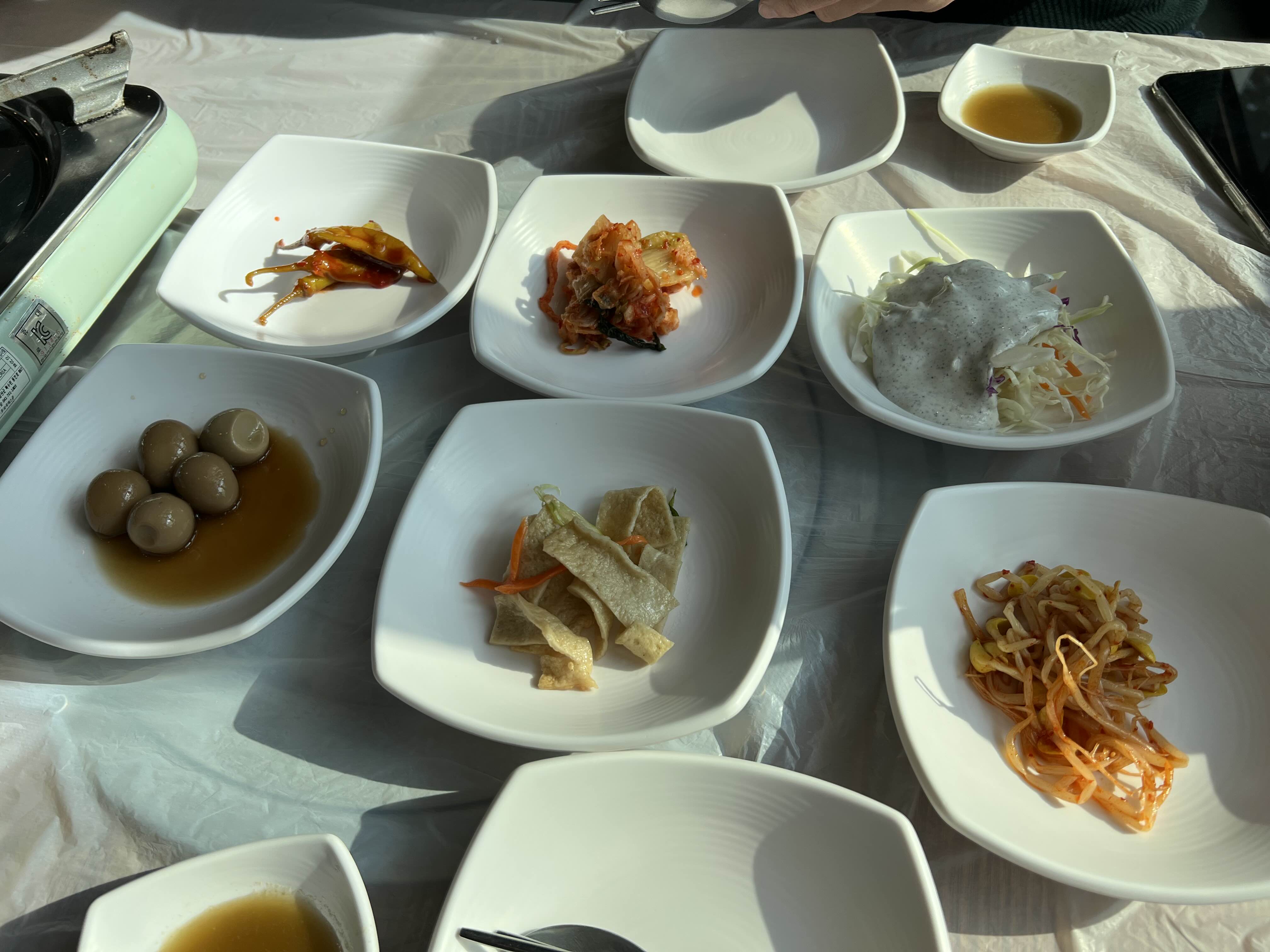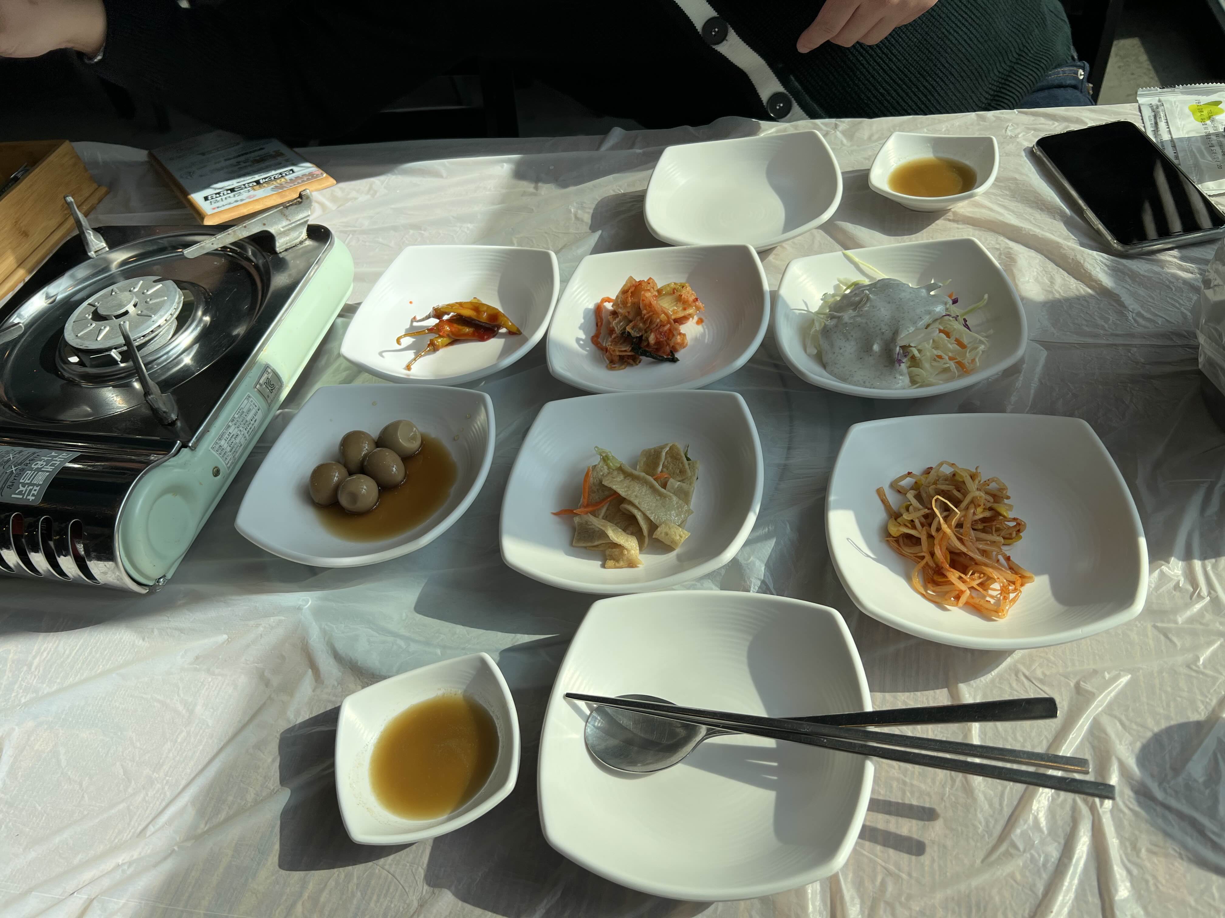 갈비찜을 끓일 버너와 초고추, 콩나물, 어묵, 메추리알, 샐러드, 김치, 간장 소스의 밑반찬이 나왔습니다.