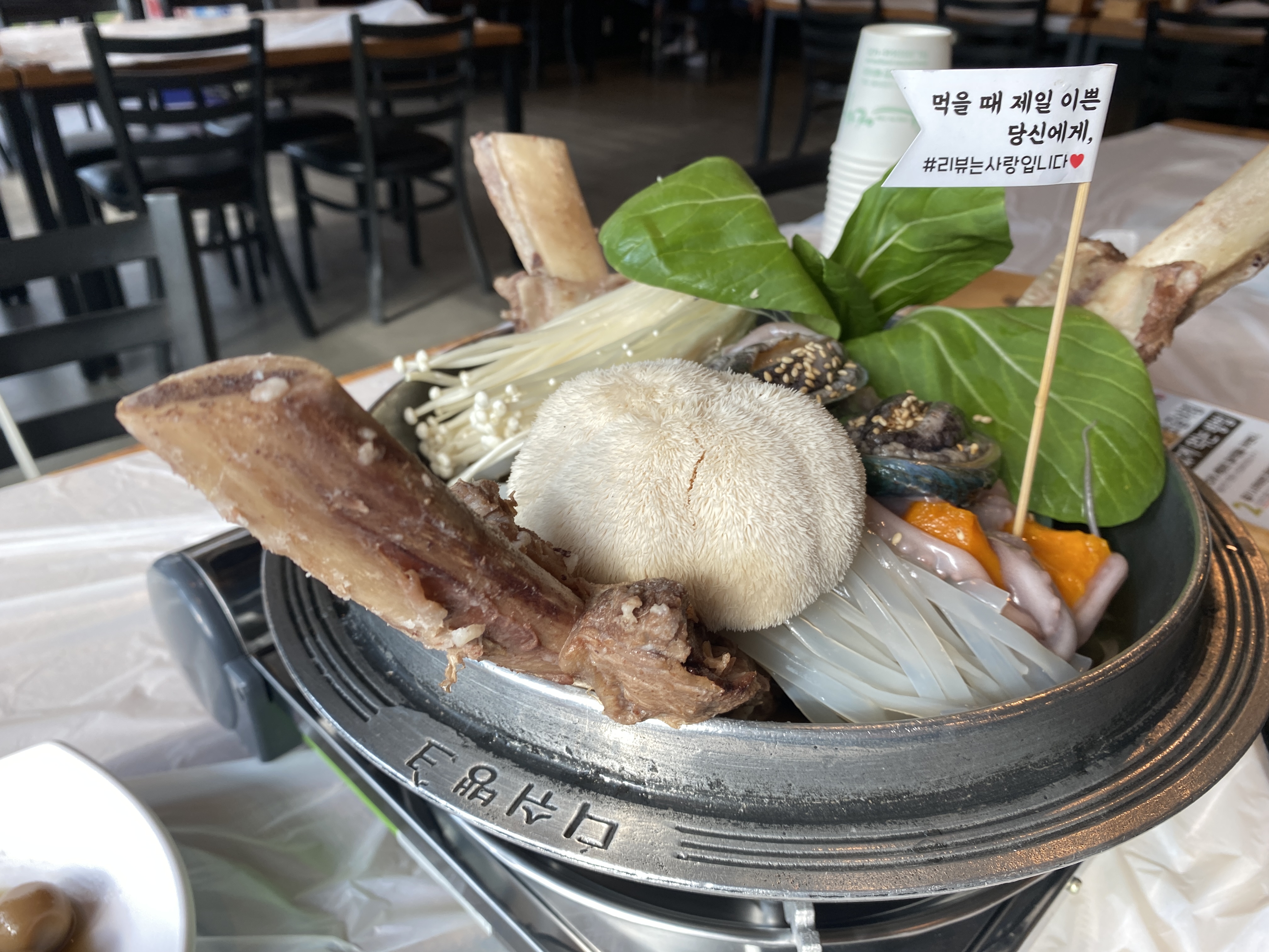 갈빗대 세대를 저런식으로 꽂아서 주고 그 위에 버섯, 청경채, 단호박 등의 갖가지 채소랑 해산물이 올라갑니다.