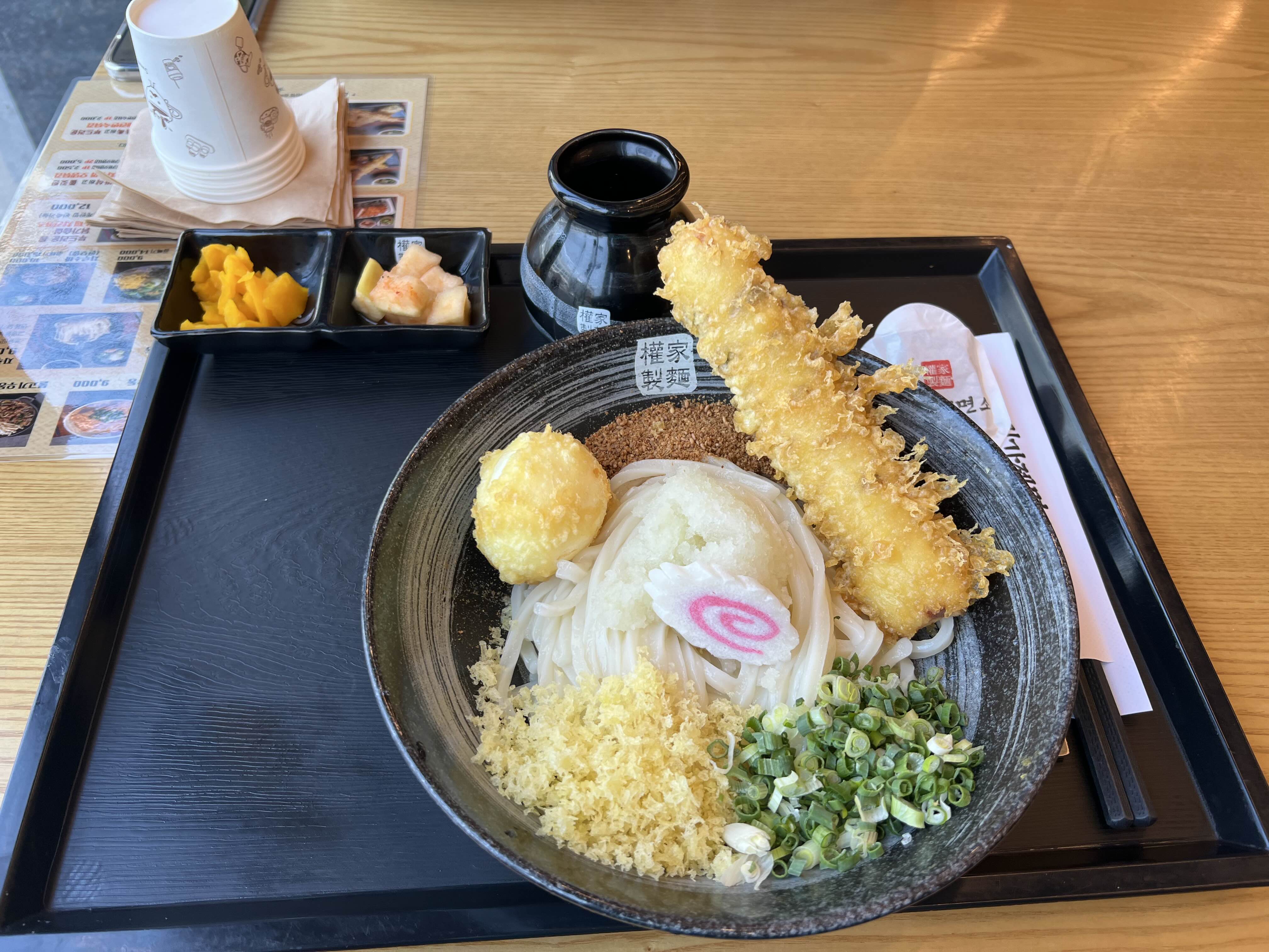 치쿠타마 붓카케 우동입니다. 일본식 간장소스인 쯔유를 부어서 먹는 비빔우동입니다. 튀김은 새우인가 했는데 오징어더군요.