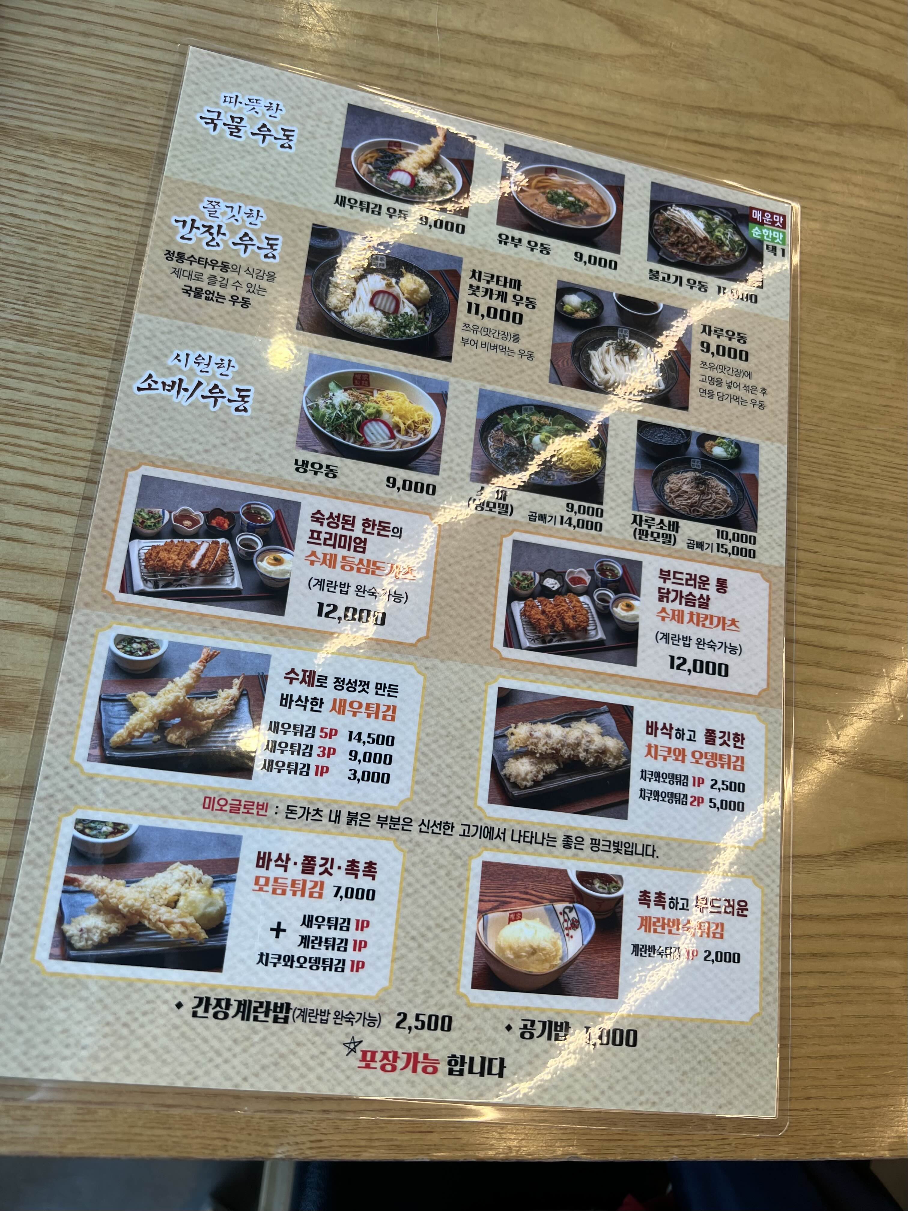 메뉴는 우동과 돈까스가 있는데요, 우동은 9천원에서 11천원, 돈까스는 12천원 선입니다. 싸이드메뉴로 새우튀김, 오뎅튀김 등도 있습니다.